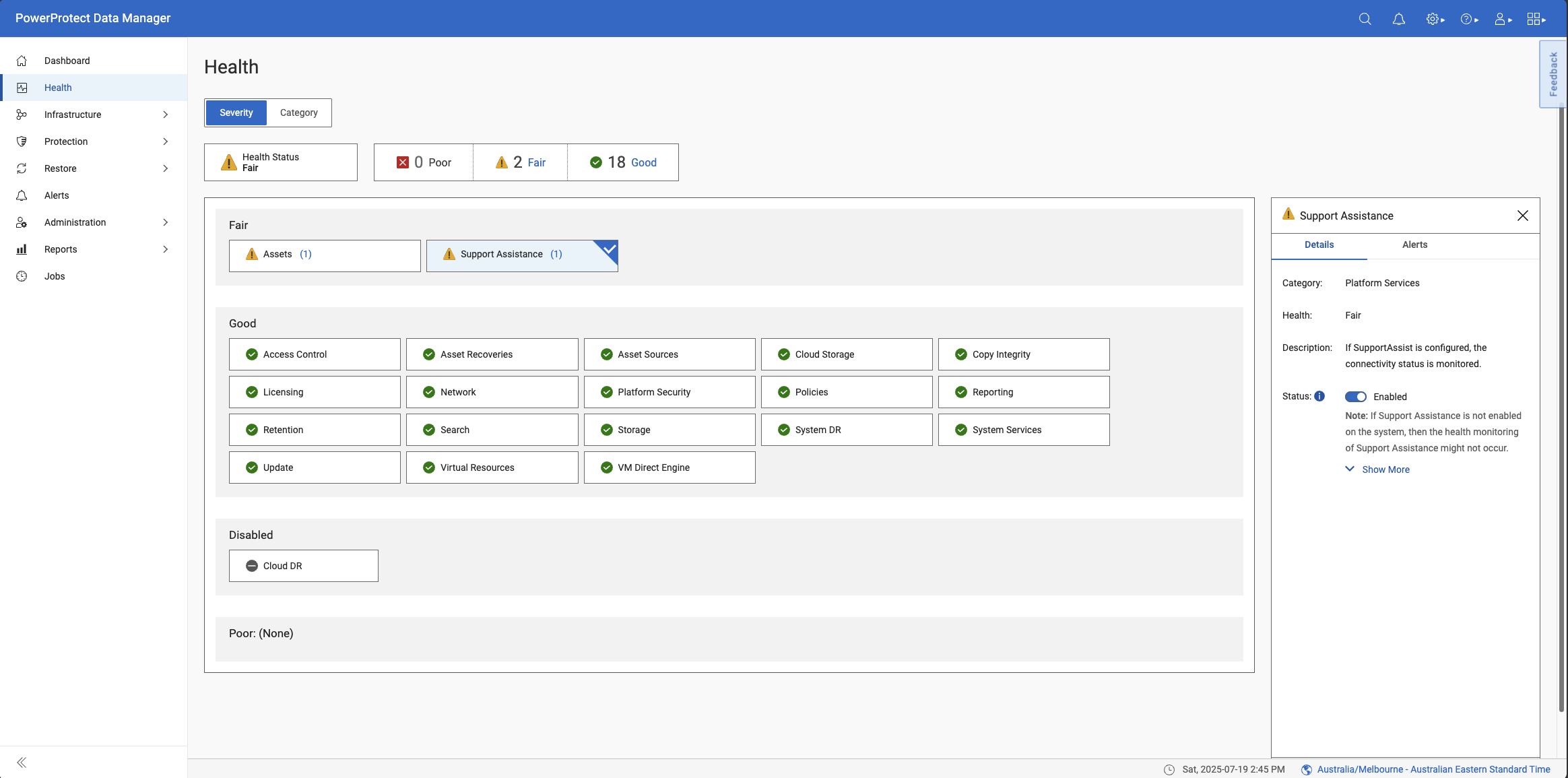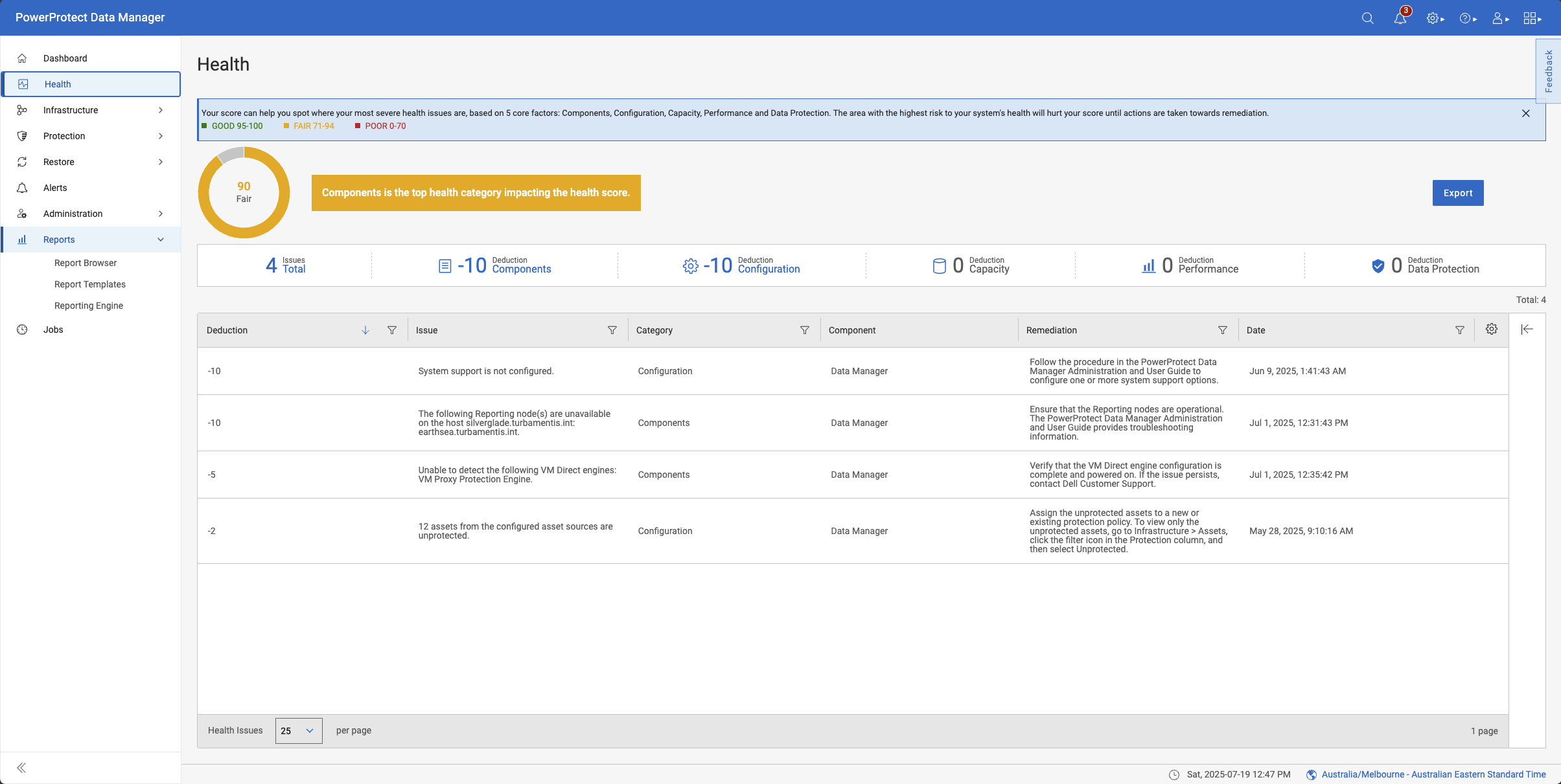 Health in Data Manager has been redesigned to give you easier, simplified access to the health of the system. Moving away from a health score, Data Manager now gives you health information in a layout that lets you quickly triage and address any issues that may be occurring on the system. This includes being able to: