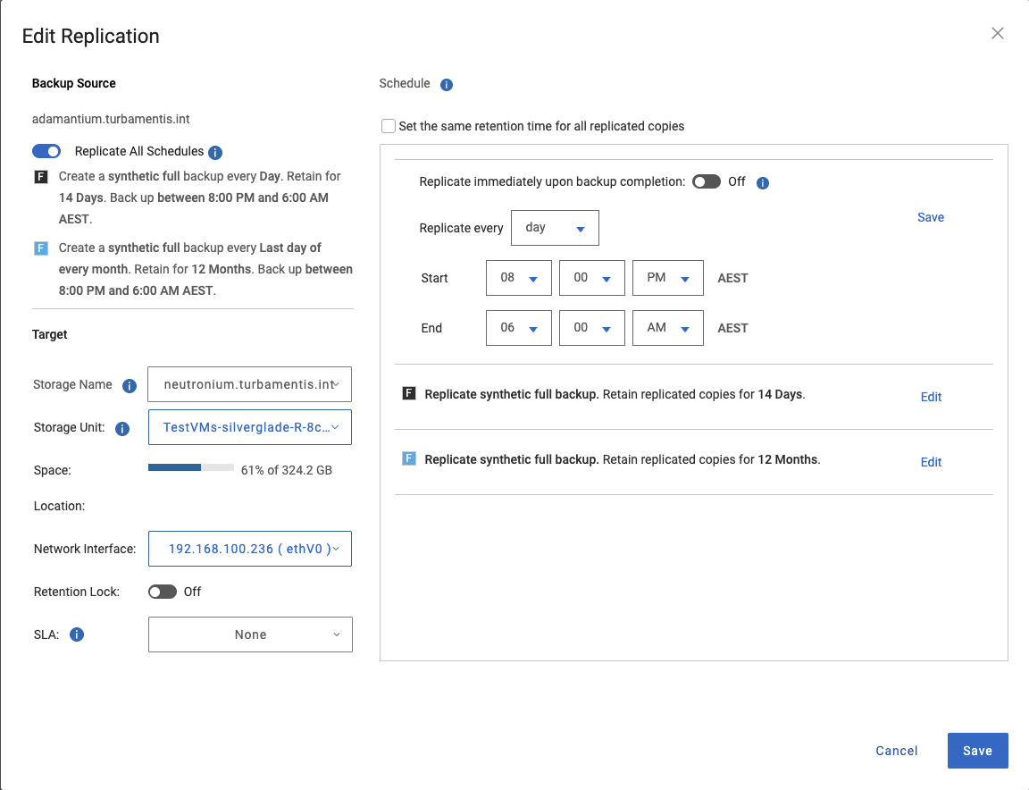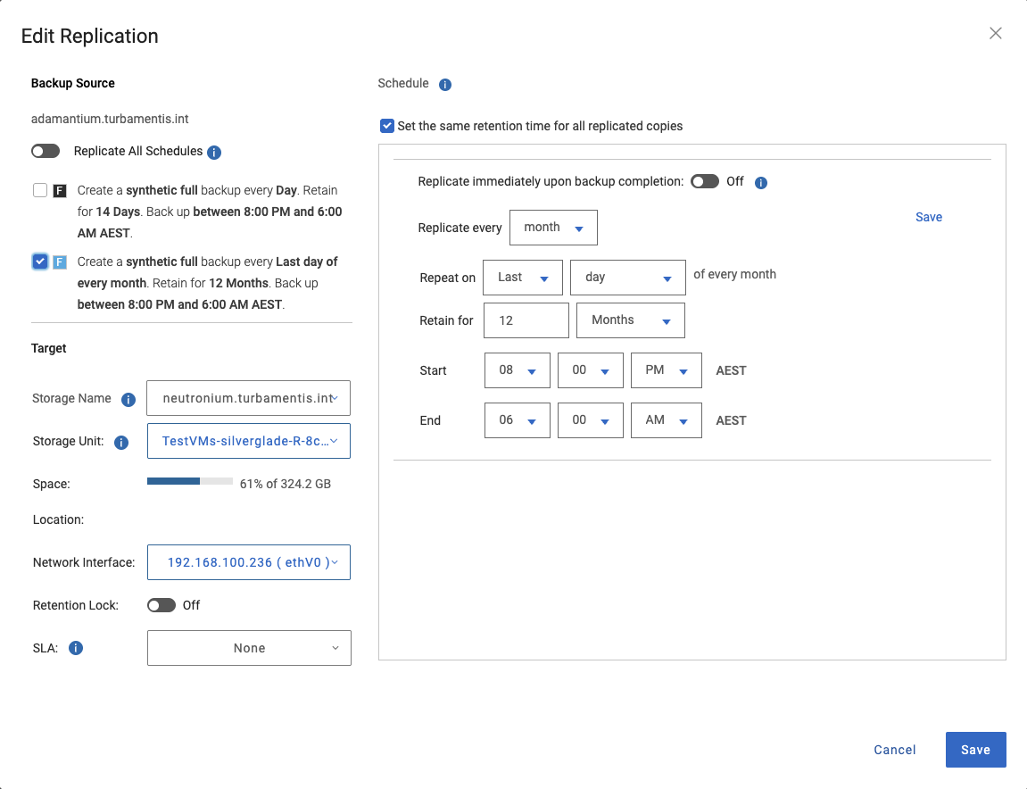 With those options chosen, my daily backups won’t be replicated but my monthlies will be. Now, again, this isn’t something you want all the time – typically you do want all your backups replicated, but in situations where you’ve got really low-bandwidth links between sites but you still need to get the monthly backups replicated, this option will simplify your configuration.