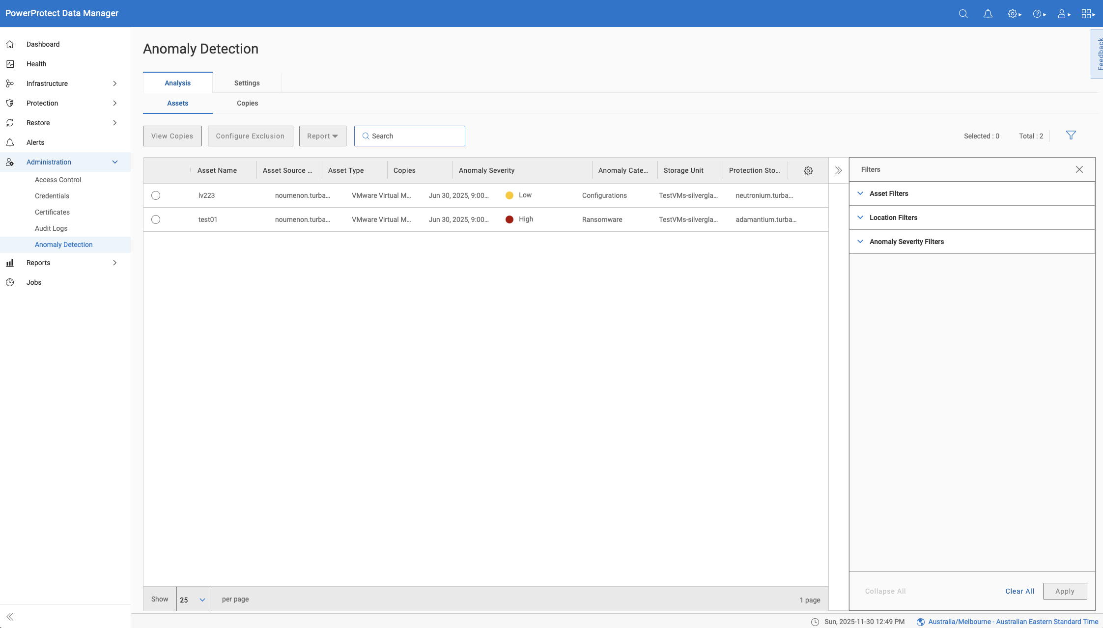 From the Control Centre, you’ve got easy access to both the Analysis status and the Settings – shown above you can see we’re in the Analysis area, where you can switch between analysis for assets, and copies, within your environment.